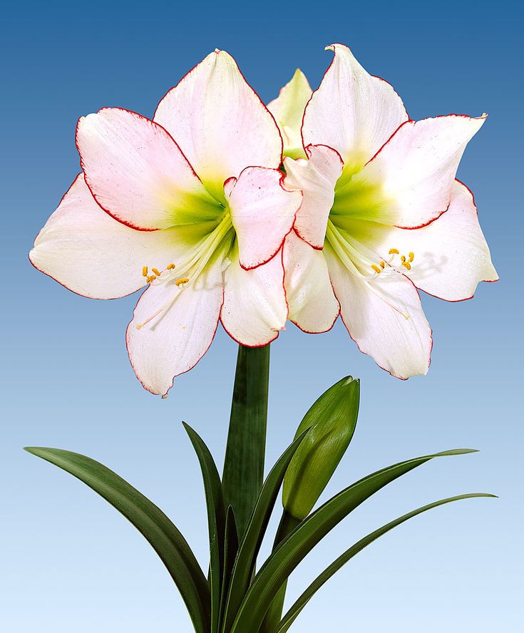 Амариллис простой пикоти - это великолепное растение с белоснежными цветками, украшенными красной окантовкой. Его стебель достигает высоты 50-70 см, а размер цветка составляет 15-16 см. Листья имеют интересную форму и добавляют декоративности этому растению.