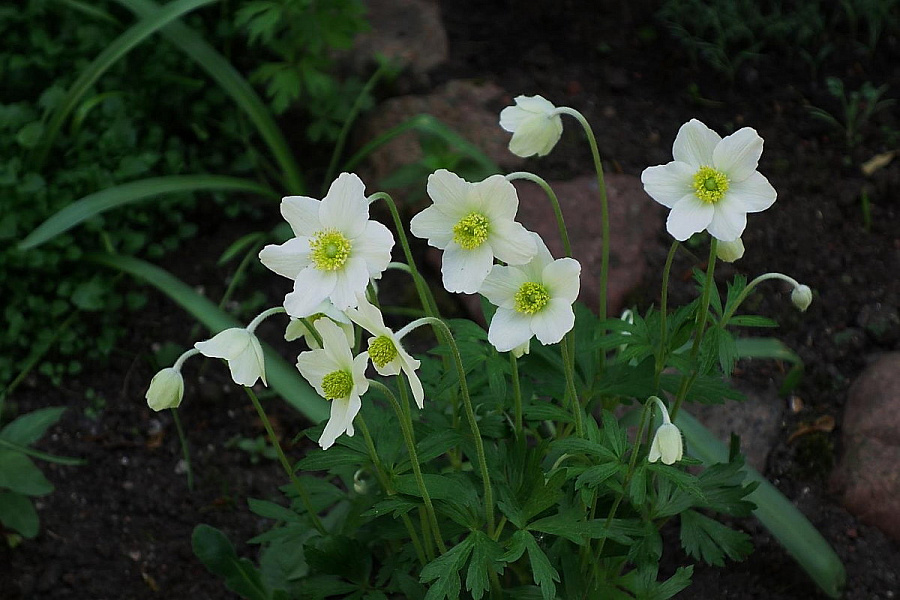 Саженцы анемоны лесной (Anemone sylvestris) обладают простой неброской красотой, цветы часто используются для создания нежных букетов невесты. Побеги растения достигают в длину около 20 сантиметров. В их нижней части сосредоточены резные зеленые листья. В конце мая растение выпускает цветоносы с одним крупным пятилепестковым цветком (до 7 сантиметров в диаметре) белого цвета с желтой серединкой. Цветет анемона около 3 недель. Предпочитает затененные места, хорошо развивается под деревьями и кустарниками. Предпочитает легкие, плодородные, достаточно увлажненные почвы. Анемона самостоятельно размножается самосевом.