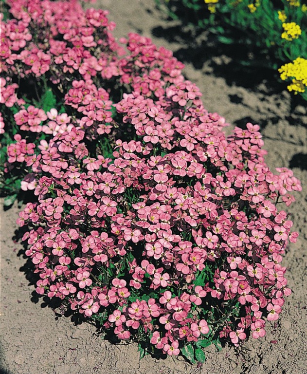 Рассада арабиса кавказского Pinkie (резуха Arabis caucasica) лучше всего растет и цветет на солнечных местах, но выносит и полутень. Участок для посадки выбирают с рыхлой, проницаемой и довольно влажной почвой. Высота взрослого растения около 20-25 см, диаметр кустика – до 60 см. Тонкие веточки арабиса кавказского Pinkie покрывают мелкие зеленые листочки с серым опушением. В мае – июне многолетник цветет ярко-розовыми бутонами. Используют растение чаще всего в различных композициях с камнями или в роли почвопокровного на фоне газона.