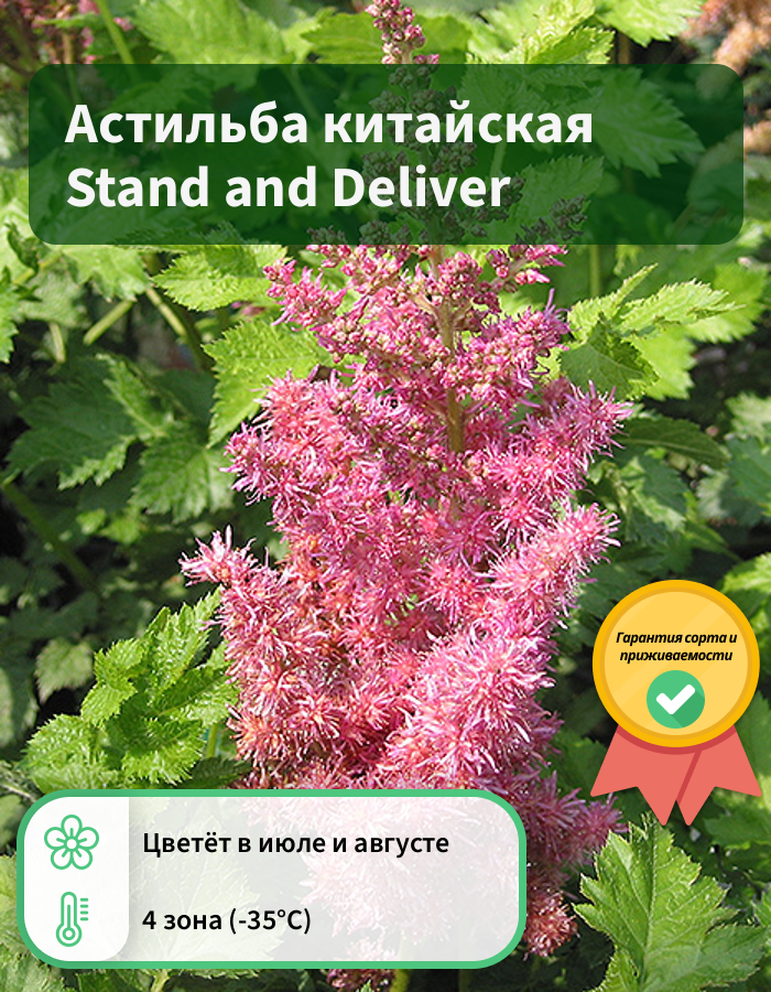 Саженцы Астильбы китайской Стэнд энд Деливер (Stand and Deliver) расцветают во второй половине лета роскошными пурпурно-розовыми соцветиями - метелками. Растение привлекает своей нетребовательностью к уходу, морозостойкостью (до минус 34 градусов) и иммунитетом к недугам. Многолетник хорошо растет на глинистой почве, ему не страшно небольшое переувлажнение, а вот засухи он не выносит. Ландшафтные дизайнеры рекомендуют размещать астильбу в ажурной тени, например под кроной деревьев. Компанию многолетнику составят ирисы, лилейники, хосты, гейхера, спиреи.