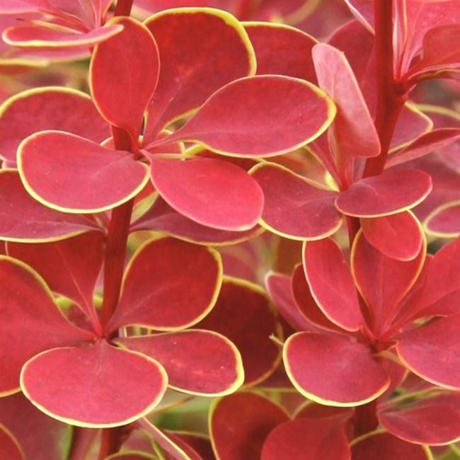 Саженцы Барбариса (берберис) Тунберга Оранж Санрайс (Orange Sunrise) образуют крупные раскидистые кусты с многочисленными побегами, высотой до 140 сантиметров. Листья овальные, насыщенного красно-пурпурного цвета с желтой четкой окантовкой по краю. Крона выглядит ярко и празднично на протяжении всего летнего сезона. Осенью на растении созревают алые плоды с блестящей кожицей.