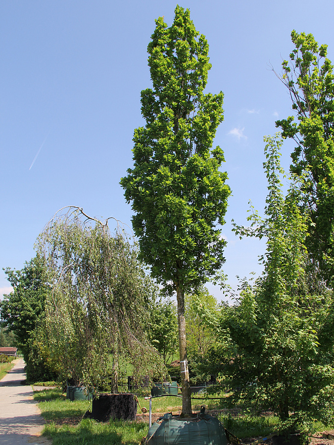 Саженцы Дуба черешчатого Фастигиата (Fastigiata, Quercus robur) – лиственное дерево с узкой, колоновидной, темно-серой кроной и гутыми неукоснительно вертикальными ветвями. Вырастает высотой до 15 метров с диаметром 5-метров. Живет больше века. Цветение обычно в мае незначительными цветками. А в июле-августе идет созревание плодов в виде желудей. Дуб черешчатого Фастигиата имеет лопастные, обратнояйцевидные, зеленые листья, которые осенью становятся желто-бурыми. Любит свет, особенно освещение макушки кроны. Не особо прихотлив к плодородию грунта, но не выносит известковую и влажную почву. Украшает скверы, парки, улицы, подходит для солитерных посадок и группами.