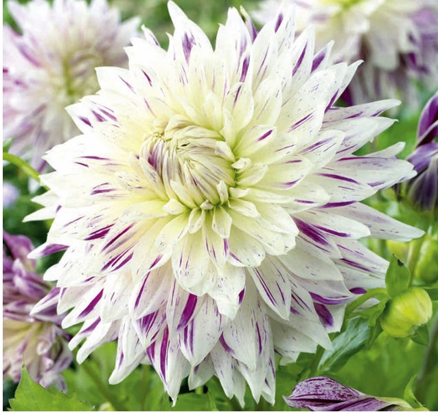 Луковицы георгины махровой Акита Страйпед (Dáhlia variabilis Akita's Striped), посаженные в саду в апреле-мае, подарят вам эстетическое удовольствие от белоснежных махровых цветков с продольными фиолетовыми штрихами на лепестках. С изысканными цветами необычной окраски удачно сочетается темно-зеленая листва. Сорт обладает тонким приятным ароматом. Диаметр соцветия достигает 15 сантиметров. Высота стеблей — 80-100 сантиметров, они прочные, не нуждаются в дополнительной опоре. Цветение длительное, продолжается с июня по сентябрь. Георгины Акита Страйпед отлично смотрятся и в отдельных групповых посадках, и в композиции с другими растениями. Устойчивы в срезке.