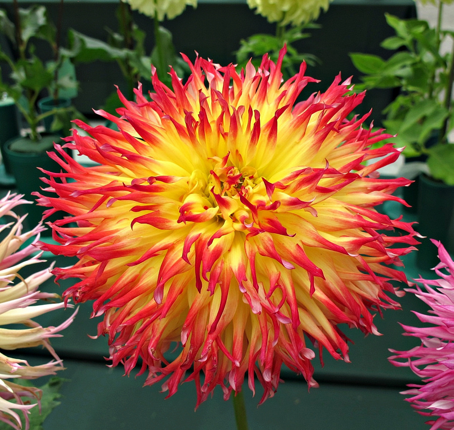 Георгина бахромчатая Pinelands Pam - это великолепное растение с ярко-желтыми цветками и красно-малиновыми кончиками, которое порадует вас своим великолепием в течение нескольких месяцев в году. Ее высота может достигать 90 см, а размер цветка равен 20 см, что делает ее настоящим украшением любого сада.
