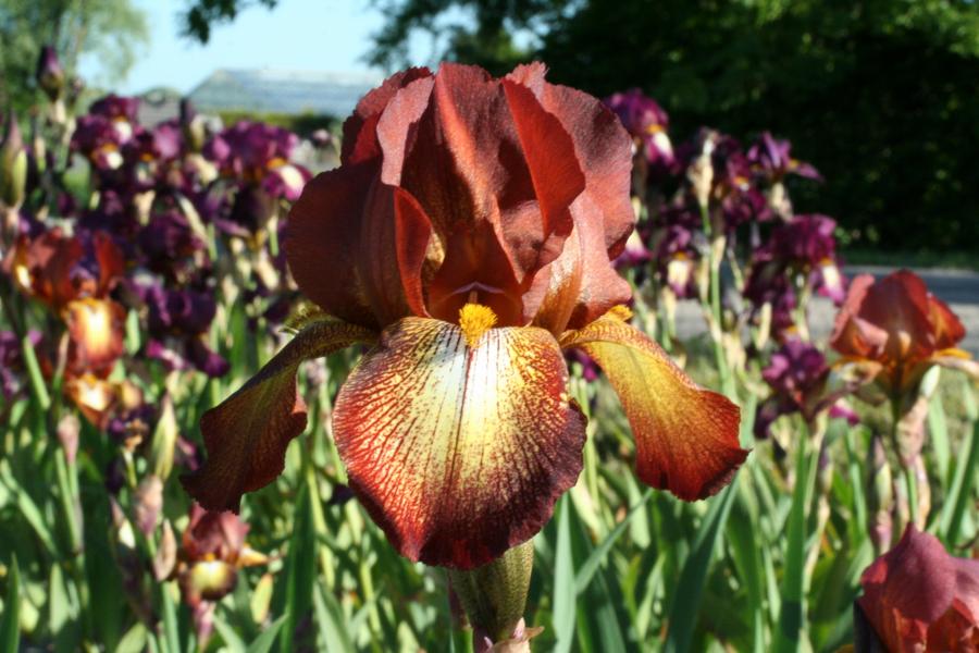 Рассада Ириса Римфайе (Rimfire) великолепно вписывается в дизайн сада или территории возле дома. Высаживать её можно уже в начале весны, чтобы на протяжении всего июня наслаждаться изумительным внешним видом декоративного растения. На длинных цветоносах распускаются огненные бутоны насыщенного тёмно-розового окраса, по центру нижних лепестков – белое пятно, бородка оранжевая. Свою декоративность растение сохраняет до самой осени, в начале августа можно собирать семена ириса Римфайе, которые потом используют для размножения. Растение эффектно смотрится в посадке небольшими группками, хорошо сочетается с другими декоративными культурами.
