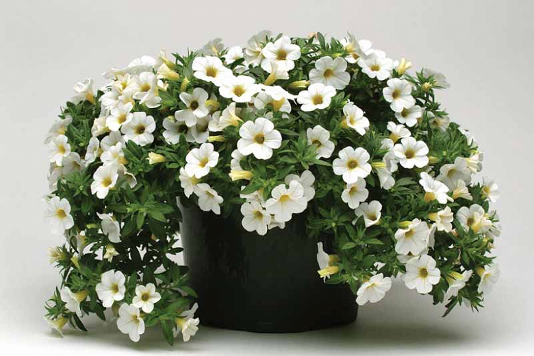Саженцы калибрахоа Вайт (Calibrachoa Can-Can Rosies White) украсят любой участок необычными белыми воронкообразными цветками, состоящими из двух рядов лепестков.