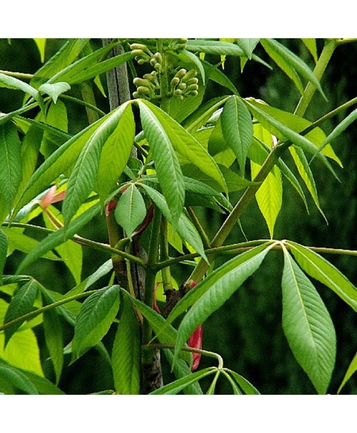 Саженцы Каштана конского сизоватый (Aesculus glaucescens) представляют собой невысокое дерево, высота которого варьируется от 10 до 15 метров. Крона не плотная, округлой формы. Листья имеют форму удлиненной продольной лодочки и расположены на коротких черенках, собранных в композиции по пять штук. Соцветия представлены небольшими пирамидками, рыхловатые. Каштан конского сизоватый отлично чувствует себя в умеренно увлажненном грунте, с суглинистой почвой. Солнце должно быть доступно для дерева, хотя наличие небольшой тени не скажется на каштане негативным образом. А вот высаживать каштан в климате с сильными морозами, пожалуй, не стоит: для него заморозки могут быть губительны.