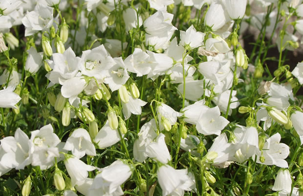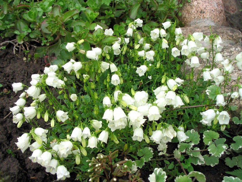 Семена и рассада колокольчика ложечницелистного Бавария Вайт (Bavaria White) быстро разрастаются, покрывая землю плотным зеленым ковром. В начале лета среди зеленой листвы распускаются нежные маленькие цветочки белой окраски. Из-за их обильного количества почвопокровник кажется белым полотном. Этот сорт прекрасно подходит для оформления невысоких подпорных стен и каменных горок.