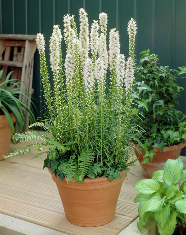 Рассада лиатриса Альба (Alba) отличается эстетичностью форм. Имеет многолистный стебель, который увенчанный изящной розетку соцветий свечеподобной формы. Вырастает около 70-80 см в высоту. Цветет в июне-июле белым цветом. Свечеподобная форма соцветия начинает распускаться с верху в низ что выглядит очень необычно. Преимущества лиатриса Альба: - неординарное цветение - компактный, аккуратный вид - не требует сложного ухода Луковицы лиатриса Альба нужно садить в полутени на умеренно увлажненной, дренажной почве. Хорошо переносит засуху и не любит перенасыщения влагой. На зиму не требуется укрытие.