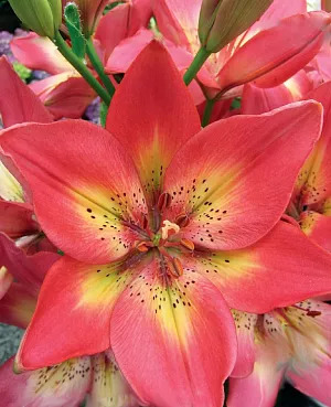 Саженцы и рассада азиатской Лилии Арсенал (Lilium asiatic Arsenal) из гибридного обильноцветущего сорта, радующего простыми и одновременно красивыми цветками, формирующимися на высоких и сильных стеблях. Крупные соцветия насыщенного розового цвета с редкими четкими вкраплениями будут акцентировать любопытствующее внимание на правильных формах и контрастной желтой середине цветка, который распускается в июне-июле. Простой уход, низкая заболеваемость, высокая морозостойкость, оперативная акклиматизация и полное отсутствие запаха – дополняют перечень положительных качеств данного сорта.