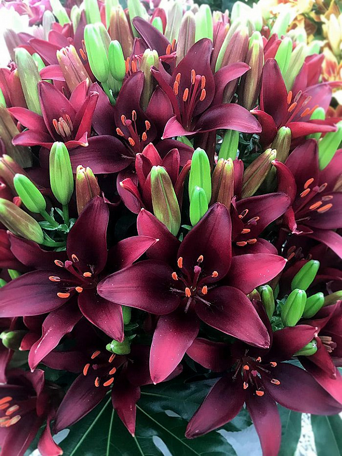 Луковицы лилии азиатской Дарк Секрет (Dark Secret) уместно разместить для контраста на клумбе с преобладанием белых цветов. Растение обладает крупными бутонами насыщенного вишнево-бордового цвета, отливающего синевой. Длинные пурпурные тычинки с оранжевыми головками только подчеркивают глубокий оттенок лепестков.