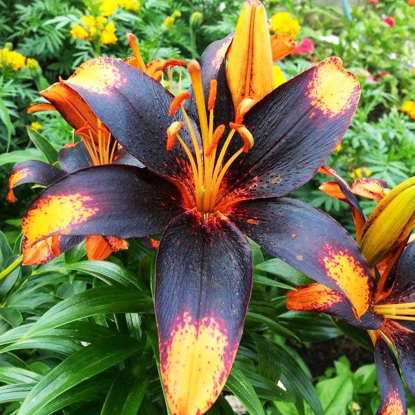 Луковицы Лилии азиатской Танго Париж Харт (Lilium asiatic Paris Heart) удивляют тигровой окраской раскрывающихся цветков. Темно-фиолетовый цвет в центре цветка контрастирует с ярко-оранжевыми кончиками лепестков. Оттенки плавно переходят из одного в другой, благодаря рассеянному темному крапу. На одном цветоносе вы не найдете ни одного одинакового цветка, природа будто раскрашивает каждый из них по отдельности. Цветение продолжительное, начинается во второй половине июня. Сорт пригоден для выгонки вне сезона.