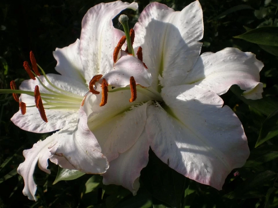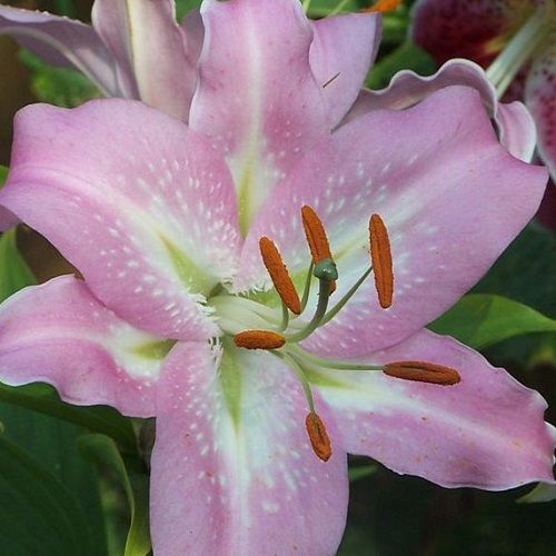 Окраска цветка : розовато-белый с редким крапом и оранжевыми тычинками, гофре по краю