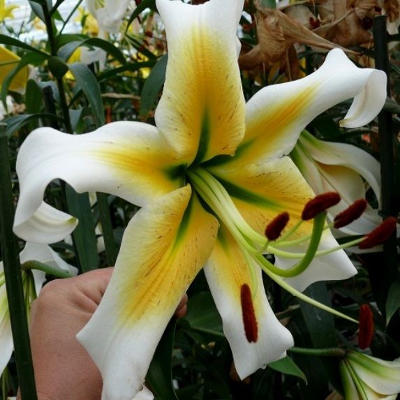 Луковицы лилии Mister pistache плохо растут на известковых почвах. Поэтому высаживать их нужно в нейтральный или слабокислый грунт. Участок выбирают солнечный или частично освещенный. На одном месте может расти до 5 лет. Высота взрослых многолетников достигает 120 см. Цветут лилии Mister pistache с июня по конец июля. Цветы крупные, до 25 см в диаметре. Окраска лепестков плавно перетекает с белой по краям до светло-желтой в центре. Дополняют бутоны мелкие бордовые крапинки.