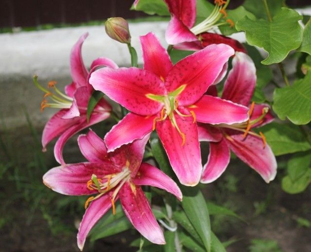 Саженцы и рассада Лилия восточная Барракуда (Lilium oriental Barracuda) украсят сад цветами во второй половине июня, июле. Высота стебля до 90 см, зелень спокойная матовая. Растение отличается необычной формой и окраской цветка. Очень крупные, до 22 см в диаметре, цветки имеют всего 6 лепестков. Форма лепестка широкая у основания с зауженными концами, края волнистые, слегка загнутые от центра. Цвет насыщенный яркий пурпурно-розовый с желтовато-белой окантовкой края. Весь лепесток покрыт темно-красными точками крапа и до середины мелкими выростами-сосочками совпадающими по цвету.