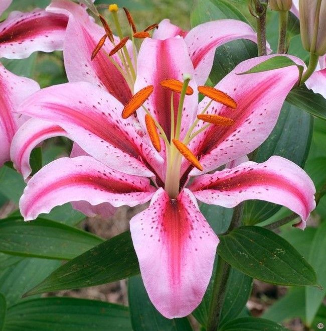 Луковицы лилии восточной Джейберд (Lilium hybrid oriental Jaybird) подойдут любителям ярких кукольных оттенков. Цветы этого сорта крупные (до 22 см в диаметре), появляются в середине и в конце лета, по несколько штук на одном цветоносе. Они окрашены в насыщенный розовый цвет, а в центре каждого лепестка находится темная бордовая кайма. Дополнительно можно рассмотреть редкий красный крап. Лилия Джейберд выглядит нарядно на клумбах и в букетах. Стебли очень прочные, достигают 120 см в высоту. Сорт популярен в летних цветочных композициях отдельно или в комбинации с другими растениями. Особенно он ценится за неприхотливость к условиям содержания и высокую морозостойкость — до –34 градусов под укрытием.