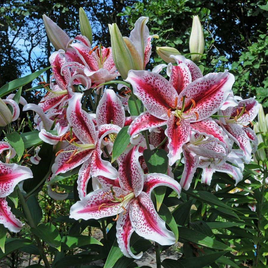 Луковицы лилии Tiger высаживают ранней весной в прохладный грунт. Подкормка этим растениям очень необходима спустя пару недель после посадки. Потом следует еженедельно поливать с чередованием различных видов удобрений. Это довольно высокая культура. Высота взрослого цветка достигает 80-120 см. Главная особенность сорта – высокая устойчивость к вредителям. Цветут лилии Tiger в июле-августе. Цветы крупные, диаметром до 20 см, окрашены в белый цвет с розовыми крапинками. Смотрятся очень эффектно как в одиночных, так и групповых посадках.
