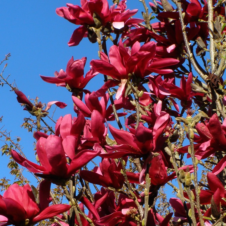 Саженцы Магнолии Бургунди Стар (Burgundy Star) – медленно растущий кустарник, он вырастает до 3 метров. Крона имеет коловидную форму. Листья полностью однотонный, без светлых сторон. Ветки оголяются на зимний период. Новые листочки появляются в конце апреля. В этот же период растение начинает обильно цвести. Очень крупные цветочки красного, даже багрового цвета источают душистый аромат .Примечательно, что гибрид не имеет синего оттенка, что характерно для такой селекции. По форме напоминают звёздочки. Кустарник любит солнечную сторону и плодородную почву, не лишними будут подкормки гумусом. Растение хорошо переносит морозы.