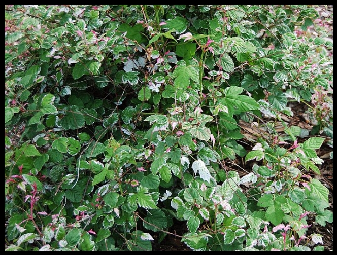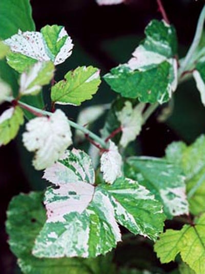 Саженцы Малины мелколистной Вариегата (Variegatus) – пышный кустарник, с раскидистыми веточками. Растение имеет маленькие листочки, которые выглядят рельефными за счёт глубины прожилок. Весной и летом цвет они зелёные, а кончики обрамлены белым цветом.