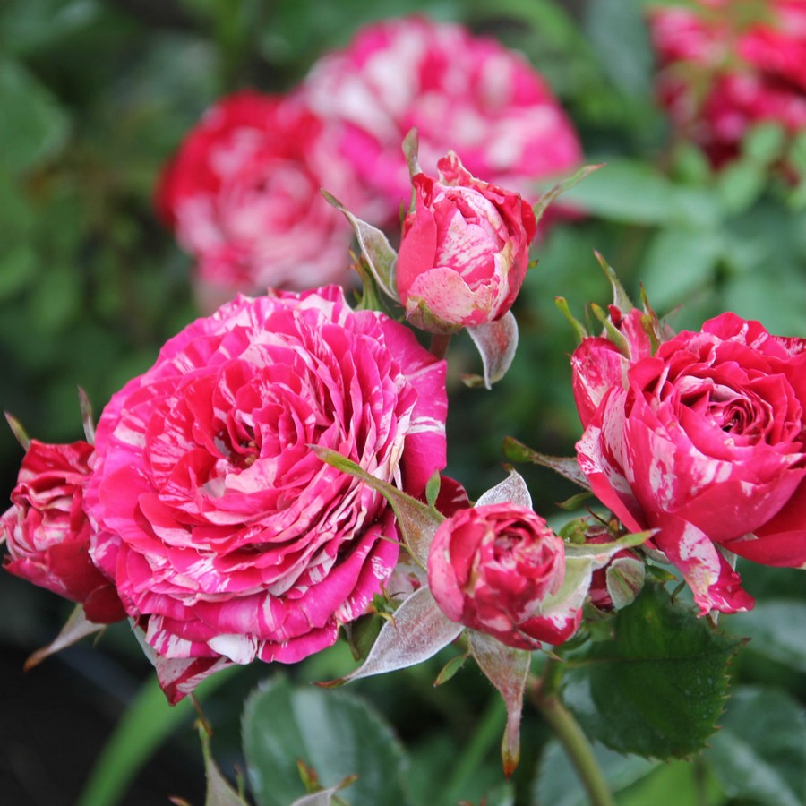 Саженцы розы спрей Arrow Folies отлично растут на солнечных участках с плодородной, увлажненной, нейтральной почвой, где нет застоя влаги. Сорт неприхотлив, отличается высокой зимостойкостью, устойчив к заболеваниям. Куст компактный, высотой всего до 60 см и шириной до 50 см. Побеги многочисленные, густооблиственные, с крупными шипами. Цветение непрерывное, продолжается с июня до сентября. Цветки махровые, диаметром 4-6 см, пурпурно-красного окраса с белыми полосами, с нежным ароматом. Срезанные бутоны могут длительное время стоять в воде и не терять привлекательности.