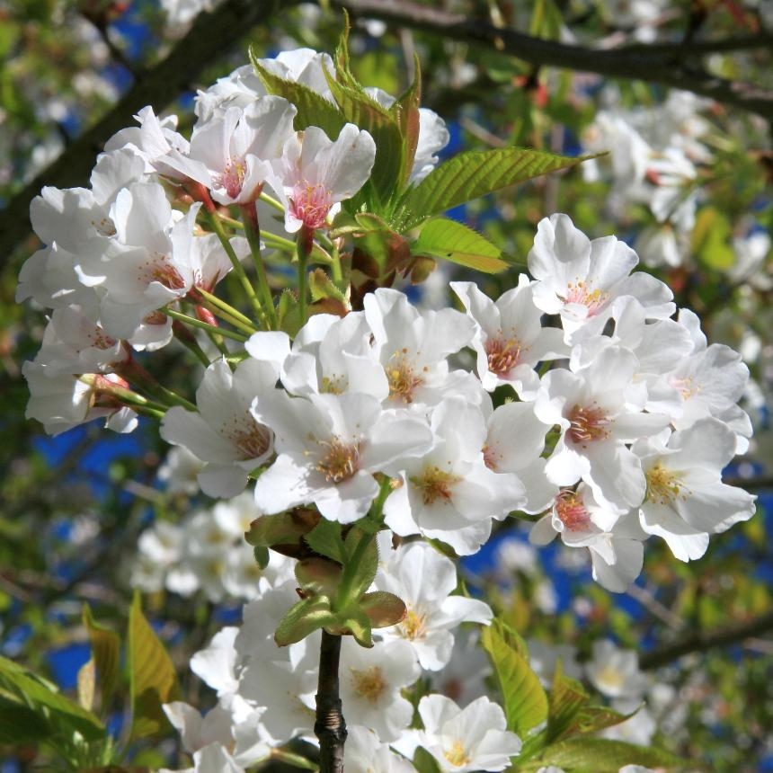На веточках растут крупные и узкие листочки в 10 сантиметров. Они имеют зелёный глянцевый верх и более светлый низ. В середине апреля появляются одиночные белые цветы. Их, как правило, очень много. Куст выглядит, будто его заспало снегом, смотрится очень красиво. Сакура морозостойка, но вот если за окном очень холодно, есть риск, что корневая система подмёрзнет.
