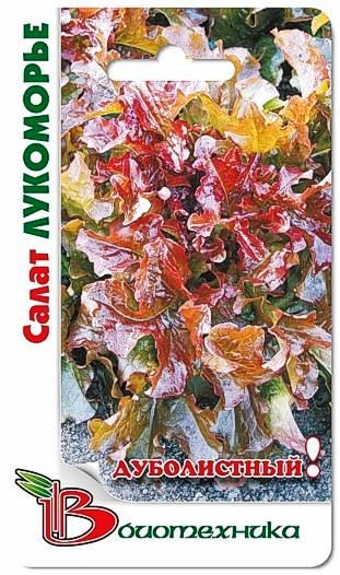 Семена салата "Лукоморье" (Lukomorie) предназначены для выращивания в открытом грунте и пленочных теплицах. Сорт среднеспелый. Период от массовых всходов до наступления хозяйственной годности составляет 75-78 дней, а при рассадном способе выращивания – 45-48 дней от высадки рассады. Розетка полуприподнятая, диаметром 30-32 см и высотой 15-16 см. Листья нежные, бордово-мраморного окраса, гофрированные. Вкусовые качества высокие. Сорт устойчив к цветушности, осадкам, почти не поражаются слизнями и улитками. Срывать рекомендуется начиная с внешних листьев.