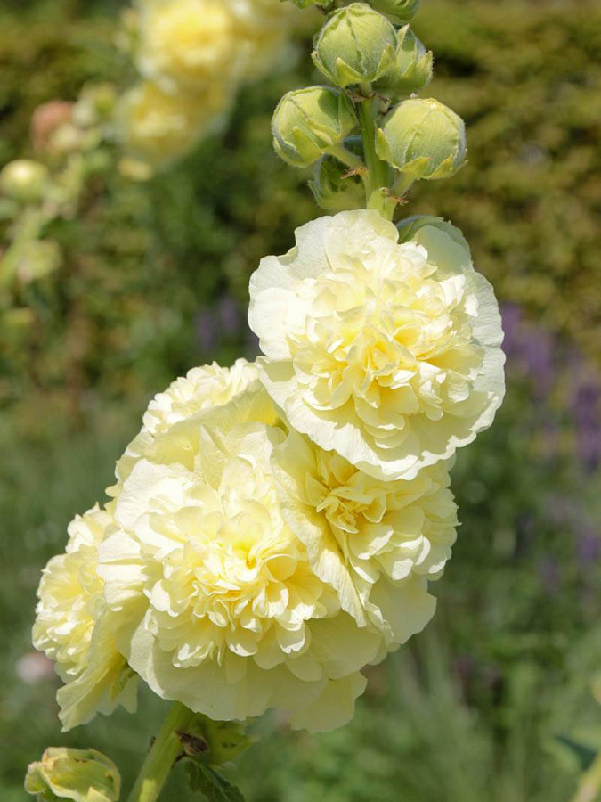 Шток-роза (мальва) розовая пленифлора жун - это изысканное растение с прекрасными жёлтыми цветками, которые радуют глаз в июне, июле и августе. Ее стебель достигает высоты до 150 см, что делает ее идеальным выбором для групповых посадок или создания живой изгороди. Листья этого растения зелёные круглый год, что придает ему особый шарм и привлекательность.