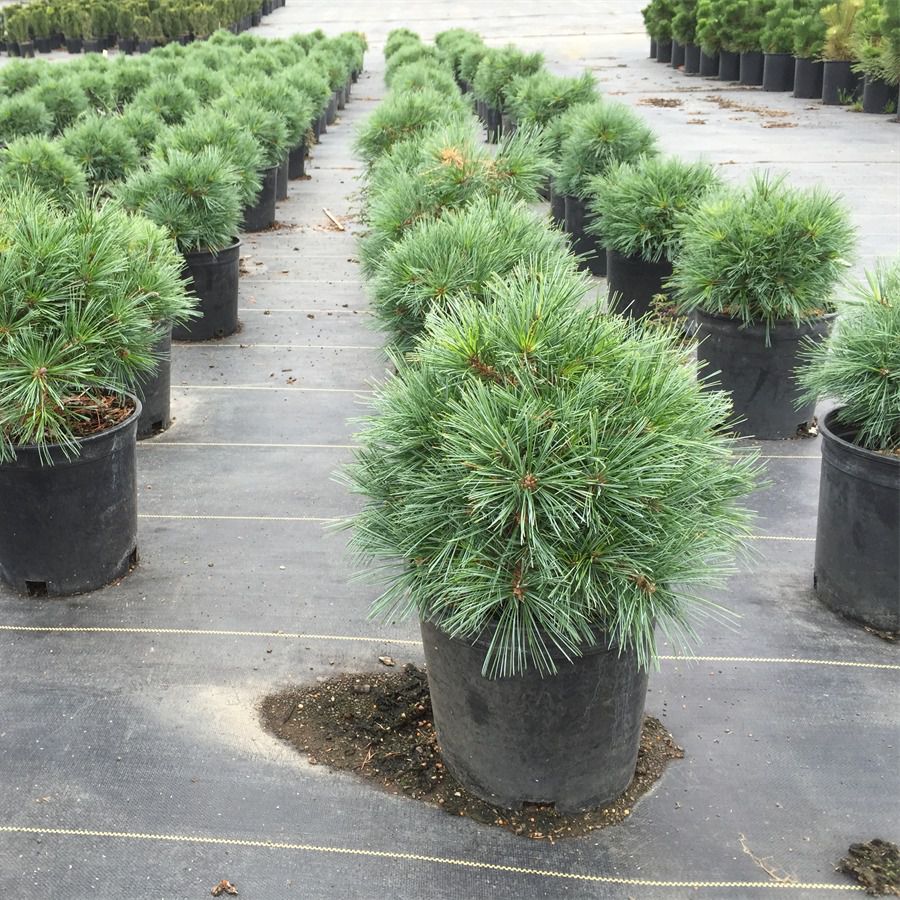 Саженцы сосны Веймутова Блю Шег (Blue Shag): декоративные шаровидные кроны карликового кустарника прямо светятся серебристо-зеленой хвоей. Габариты взрослого крупномера - до 1,5 м ширины и до 1,2 м высоты. Компактность сосны Веймутова Блю Шег позволяет использовать сорт в любых ландшафтных комбинациях. Хвоя очень длинная и мягкая, с синеватым отливом, растет пучками по 5 штук. Шишки длинные, конической формы, бледно-бурого оттенка.